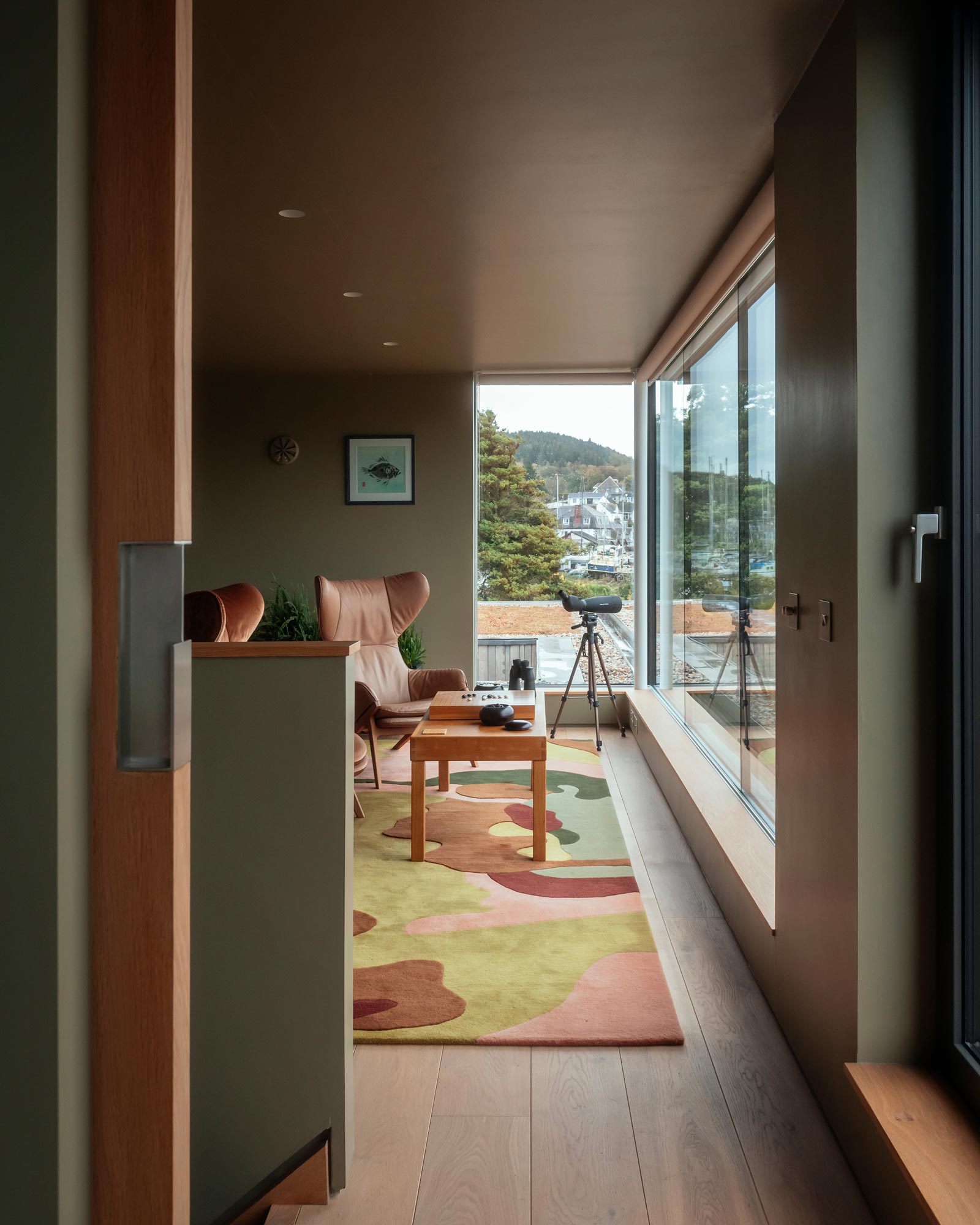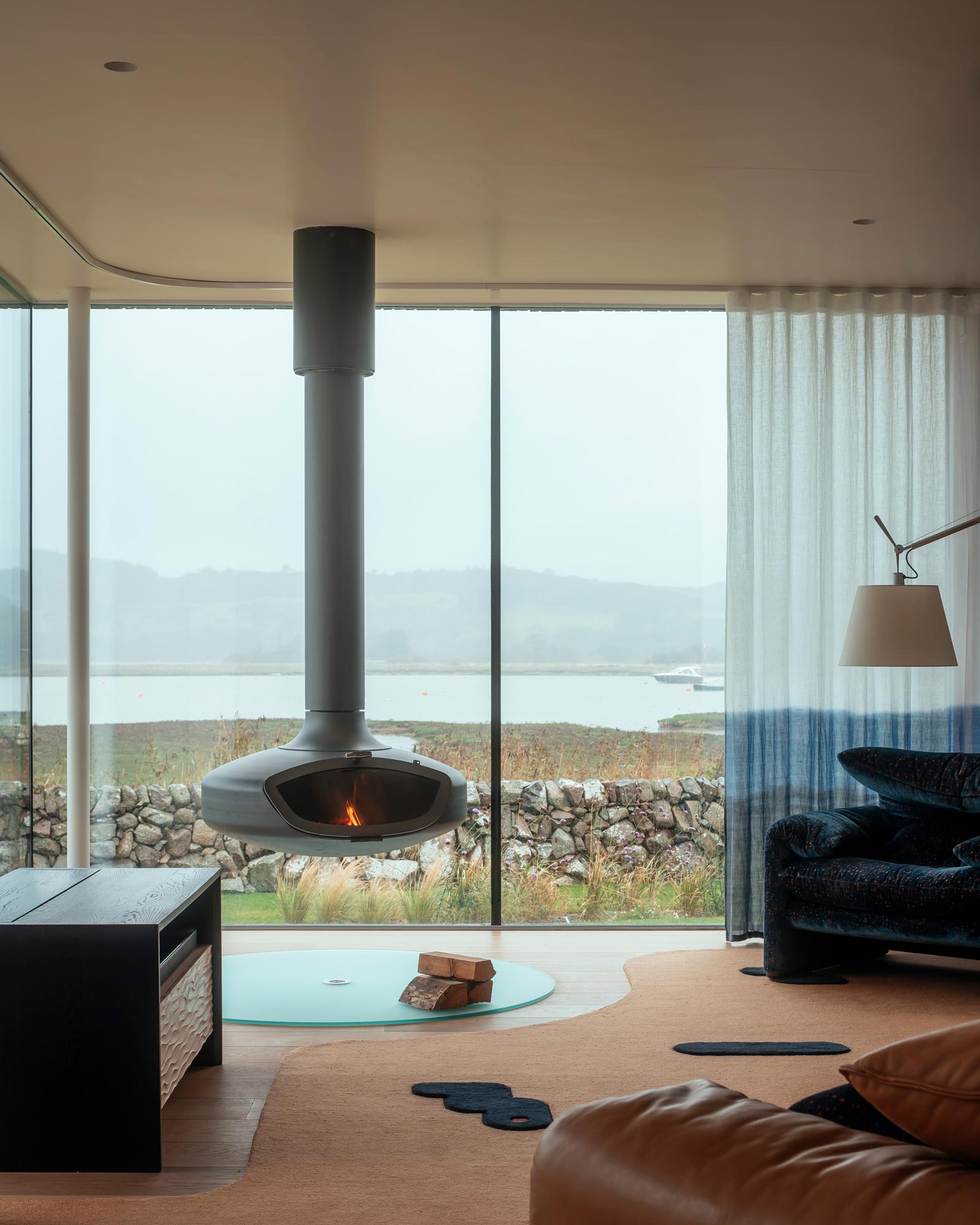 Silverwood is a new build residential house on the shores of the River Urr on the Solway Coast, South West Scotland. Designed for Mr & Mrs Buckley, the house comprises 3 bedrooms, a Studio and a Gin & Tonic room for relaxing and watching the scenery go by. The interiors were designed by Mr Buckley in collaboration with the clients (his mum & dad) for a calming but no less colourful interior, featuring rich textiles from LeLievre, Dedar, Sam + Fox and Jane Churchill with unique rugs designed for each room, made with long time collaborators, cc-tapis.